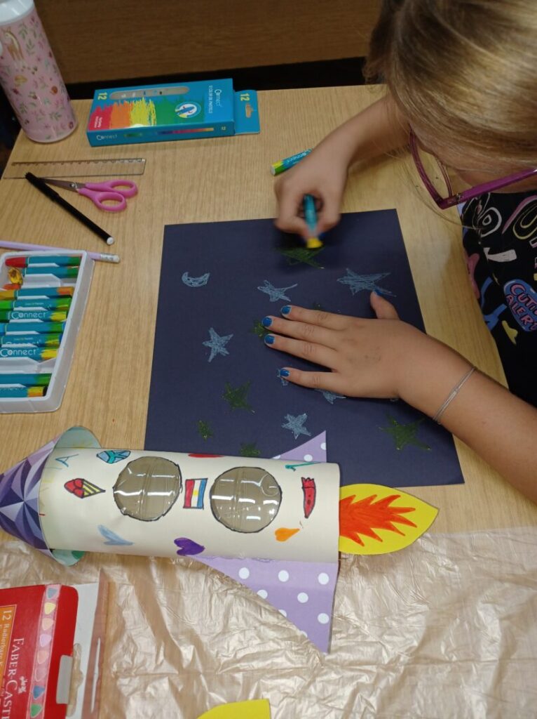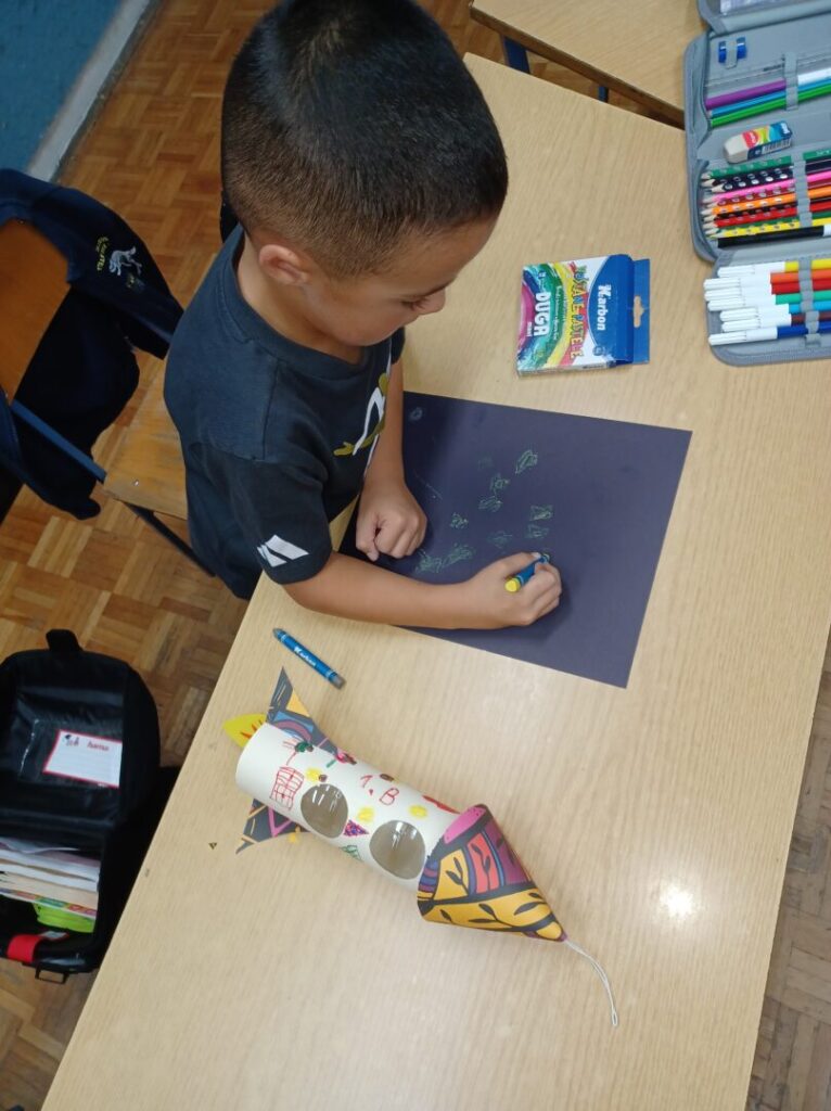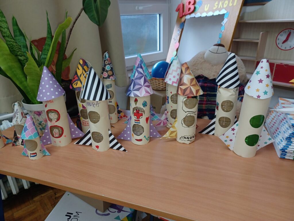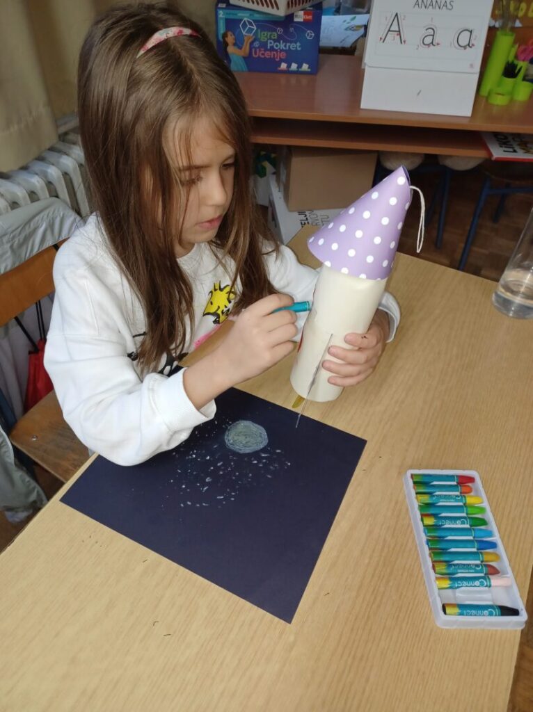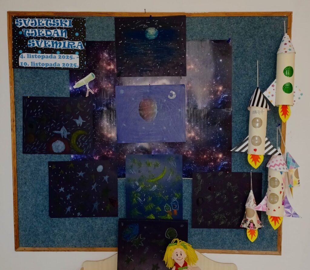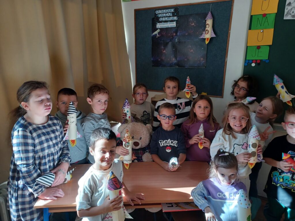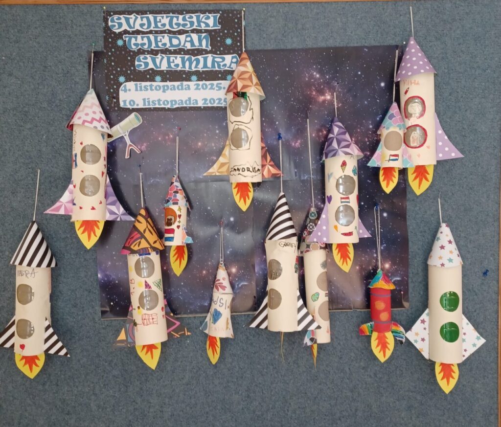 U Svjetskom tjednu svemira započeo je s radom Mali astronomski klub 1.b razreda. Svjetski tjedan svemira zaključili smo danas, veselom fotografijom naše ovotjedne aktivnosti. Raketom se vinimo u beskrajno prostranstvo – znanja jer ono je veliko i beskrajno poput svemira.