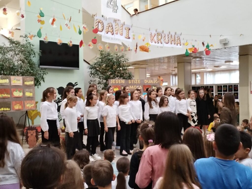 23. i 24. listopada 2025. u našoj školi obilježili smo Dane kruha i zahvalnosti. Pod geslom: “Kruh koji dijelimo” naglasili smo važnost pomaganja drugima. Program obilježavanja počeo je priredbom u školskom holu koje su pripremile naše marljive učiteljice sa svojim učenicima. Učiteljica Marija Krpan (3.a ) pripremila je pjesmu „Žuto lišće“ i scenski prikaz „Trampe“. Učiteljica Nina Dokoza (3.b) pripremila je recitaciju „Muž traži ženicu“, zagonetku „Kruh“ i igrokaz „Na kuhinjskoj dasci“. Učiteljica Ivanka Biskup (4.a) pripremila je recitaciju „Jesen na putu“. Profesorica hrvatskog jezika Jasmina Sandalić zaslužna je za organizaciju priredbe i izložbu literarnih radova.
