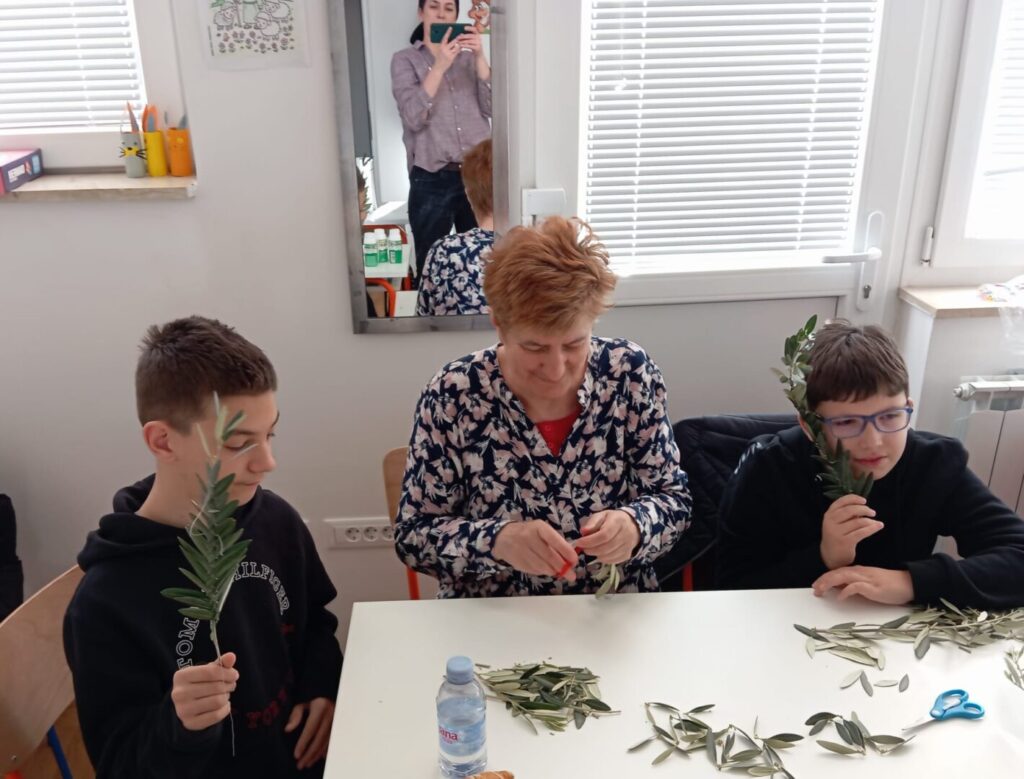 Iako nisu u punom sastavu zbog viroza nisu se pokolebali. Roko, Matej i Krševan su s asistenticama Lorenom, Ivanom i Irmom učili kako isplesti maslinove grančice po starom običaju.