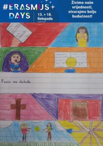 Ove godine središnja tema Dana Erasmusa su europske vrijednosti: ljudsko dostojanstvo, sloboda, demokracija, jednakost, vladavina prava i ljudska prava. Uz slogan „Živimo naše vrijednosti, stvarajmo bolju budućnost“ učenici 6.a razreda uključili su se u aktivnosti obilježavanja Dana Erasmusa od 13. do 17. listopada. Pod vodstvom vjeroučiteljice Marine Šimičev sudjelovali su s izložbom radova na temu: „Suvremeni oblici ropstva i poziv na slobodu“. Učenici su prikazali vrijednosti koje nas potiču i pozivaju na slobodu.